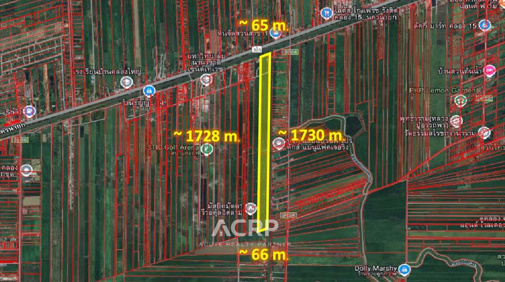 ลักษณะที่ดินแปลงที่ดินสี่เหลี่ยมผืนผ้า หน้ากว้าง 65 เมตร ลึก 1730 เมตร