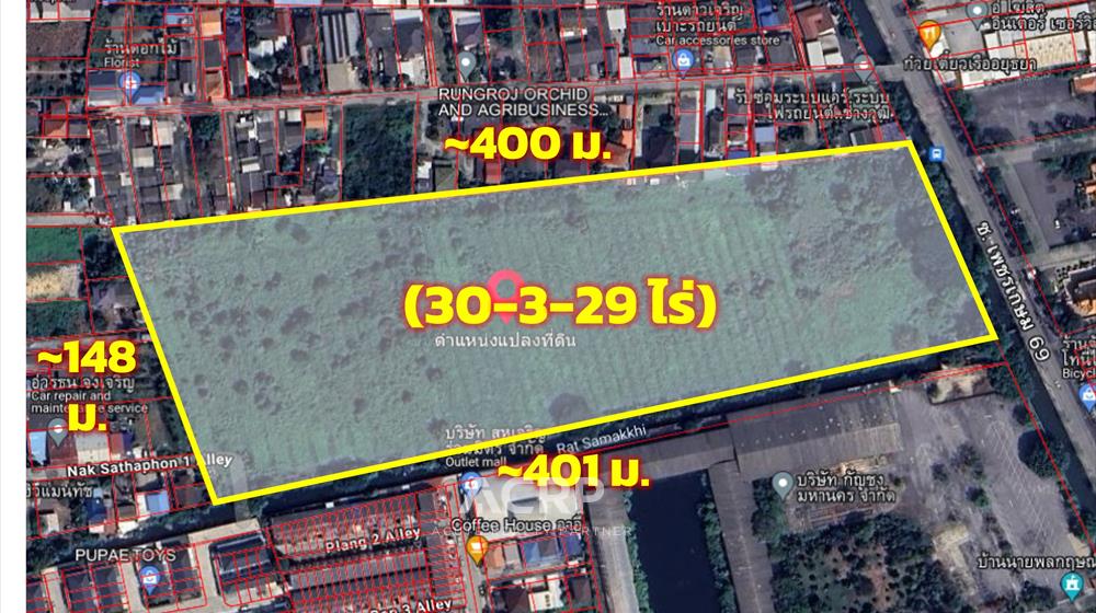 ขายที่ดินแปลงใหญ่ 30-3-29 ไร่ ซอยเพชรเกษม 69 ใกล้ Victoria Gardensทำเลศักยภาพ ฝั่งธนฯ ใกล้ถนนใหญ่ เหมาะพัฒนาโครงการแนวราบ หมู่บ้านจัดสรร หรือเชิงพาณิชย์ขนาดใหญ่ รายละเอียดทรัพย์ขนาดที่ดิน: 30 ไร่ 3 งาน 29 ตารางวา (12,129 ตารางวา)ราคา: 591,792,000 บาท (48,000 บาท/ตารางวา)ผังเมือง: สีเหลือง ย.4 (ที่อยู่อาศัยหนาแน่นน้อย)ที่ตั้ง: ซอยเพชรเกษม 69 แขวงหนองค้างพลู เขตหนองแขม กรุงเทพฯ ลักษณะแปลง- ความลึกประมาณ 401 เมตร- หน้ากว้างประมาณ 105 เมตร- ล้อมรอบด้วยพื้นที่ชุมชน พัฒนาได้หลากหลายรูปแบบ จุดเด่นของที่ดิน- ห่างถนนเพชรเกษมเพียง 400 เมตร ใกล้ห้าง Victoria Gardens และ Makro เพชรเกษม- เดินทางสะดวก ใกล้ถนนพุทธมณฑลสาย 2, สาย 3 และวงแหวนกาญจนาภิเษก- พื้นที่ขนาดใหญ่ เหมาะสำหรับพัฒนาโครงการบ้านจัดสรร, คอมมูนิตี้มอลล์, โรงเรียน หรือคลังสินค้า- ทำเลมีศักยภาพเติบโตสูง ฝั่งธนฯ เป็นโซนที่อยู่อาศัยขยายตัวต่อเนื่อง เหมาะสำหรับ- ผู้พัฒนาโครงการอสังหาฯ แนวราบ- นักลงทุนเพื่อเก็งกำไรในทำเลกำลังพัฒนา- กลุ่มทุนที่ต้องการพัฒนาศูนย์โลจิสติกส์หรือคลังสินค้าใกล้เมือง ติดต่อสอบถาม / นัดชมที่ดินเว็บไซต์: www.acr-partner.comLine ID: @acuterealtypartner