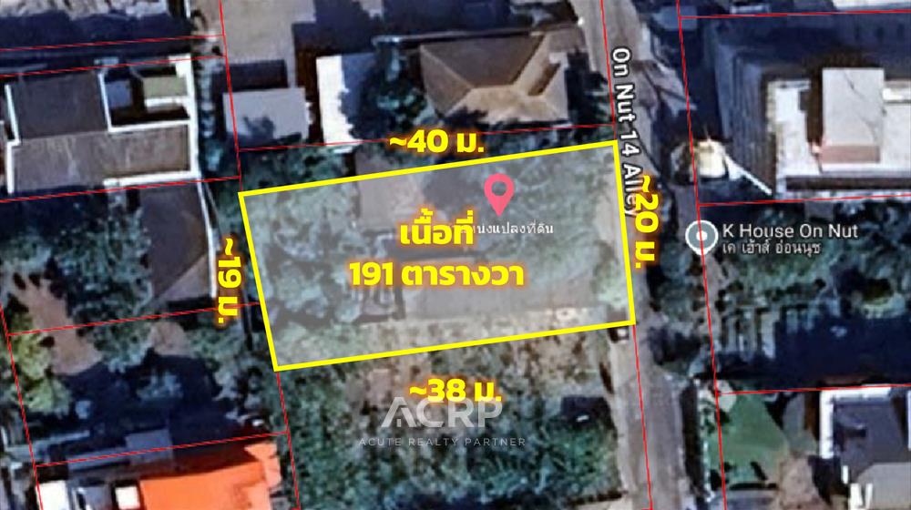 รายละเอียดที่ดินเนื้อที่: 191 ตารางวา (764 ตร.ม.)รูปแปลง: กว้างประมาณ 19 ม. ลึกประมาณ 38–40 ม.ถนนหน้าที่ดิน: ถนนสาธารณะกว้าง 8 เมตร เข้าออกสะดวกทำเล: ซอยอ่อนนุช 14 ถนนสุขุมวิท 77 เขตสวนหลวง กรุงเทพฯเงียบสงบ รายล้อมด้วยบ้านเดี่ยวและโครงการที่อยู่อาศัยราคาเสนอขาย: 32 ล้านบาท (ค่าโอนคนละครึ่ง)