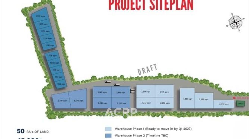 • Project completion expected by end of 2026• Total Project Area: 50 Rai• Available Space: Over 45,000 sq.m.• Unit Sizes: 1,000 – 20,000 sq.m.• Warehouse Height: 9 – 12 meters• Floor Load Capacity: 3 – 5 tons/sq.m.• Loading Docks: Elevated at 1.3 meters with hydraulic dock levelers