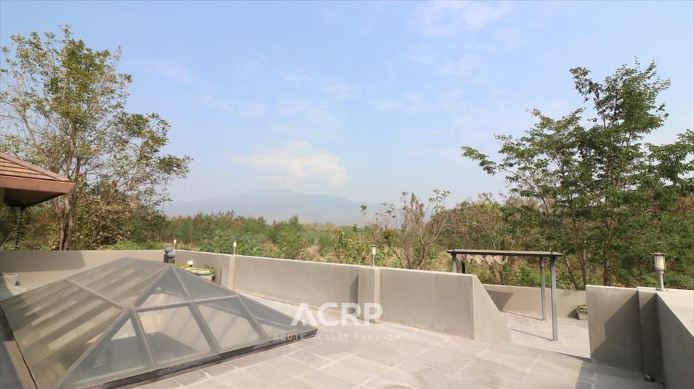 The interior highlights an indoor saltwater swimming pool with a covered roof for year-round use, a full-house ducted air-conditioning system, a decorative fish pond that enhances the serene ambiance, and a 360-degree open rooftop terrace offering panoramic views of Wat Phra That Doi Suthep Ratchaworawihan and Wat Phra That Doi Kham. The property is a resale home in condition comparable to a brand-new house, meticulously maintained by the owner and ready for immediate move-in.