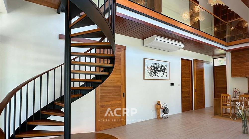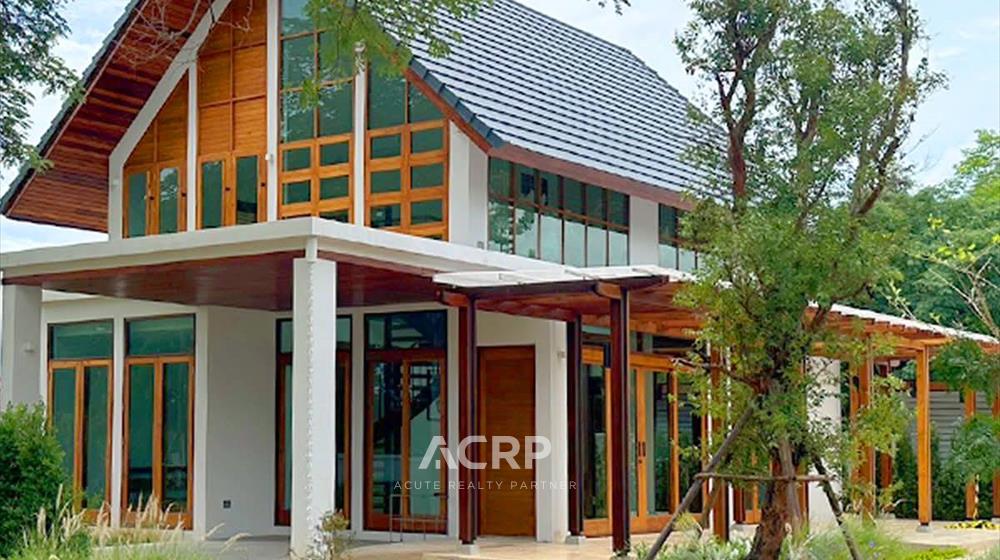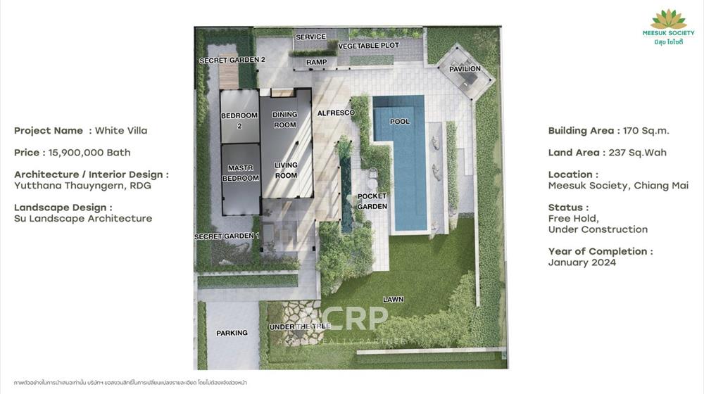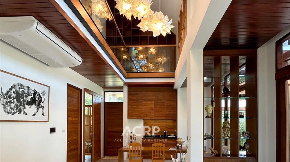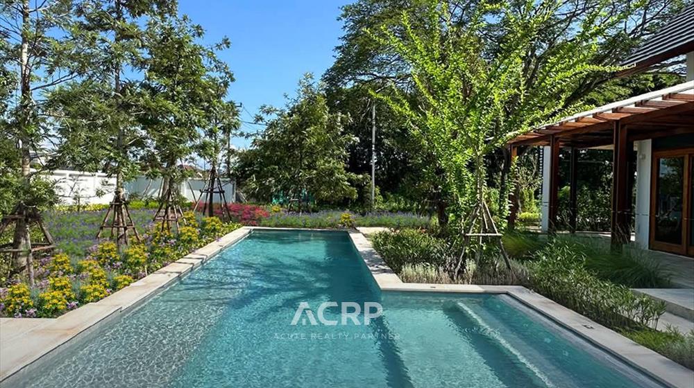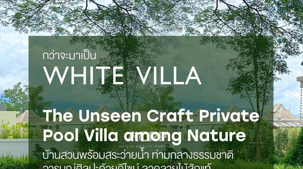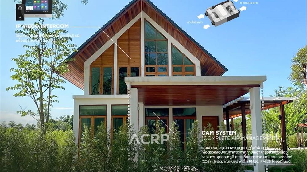 For sale White Villa, a 2-story house with a private swimming pool in the Villa Meesuk Chiang Mai project, is a villa surrounded by nature with a smart home system controlled via digital, suitable for living or making a vacation home. The 9.5-meter-high ceiling hall, Lantern design, decorated with real teak wood, has a CAM system to filter PM2.5 dust, add oxygen, control the air in the house, and an IP video intercom system for increased security. The project has complete facilities, a swimming pool, fitness, elderly care service, 24-hour security guards, and a shuttle bus to the city. It is close to important places such as Maejo University, Ruamchok Market, Lotus Ruamchok, Central Festival, Chiang Mai Airport, and Theppanya Hospital, and it is only 20 minutes to the city.