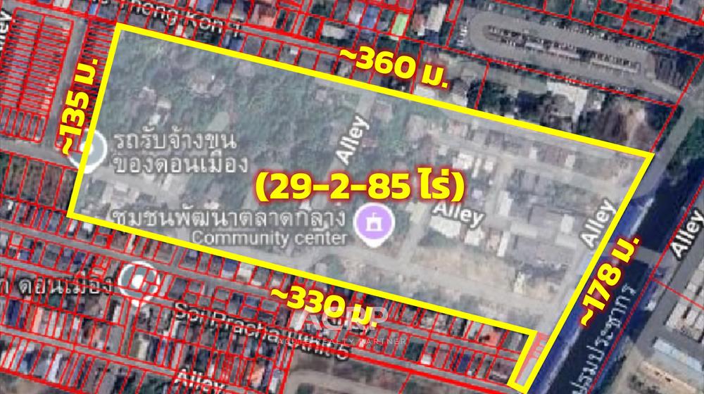 Land for Sale – 29-2-85 Rai at Pracha Uthit 5, Don Mueang | Yellow Zone (Low-Density Residential) | Ideal for Housing Development A rare opportunity for developers and investors to acquire a large land plot located in Pracha Uthit 5, Don Mueang.The site is surrounded by residential communities, easy road access, and major infrastructures including Don Mueang International Airport.This land is well-suited for low-density residential development such as housing estates, luxury homes, gated communities, or long-term land banking. Property Details- Total Land Size: 29-2-85 Rai- Selling Price: 499,000,000 THB (approx. 42,000 THB/sq.wah)- Zoning: Yellow Zone (Y.4) – Low-Density Residential- Wide access road and convenient transportation links- Only approx. 650 meters from Don Mueang Airport Location Highlights- Strong residential demand in Don Mueang and surrounding zones- High growth potential from transportation upgrades such as MRT lines and expressways- Rare large-scale land plot in northern Bangkok- Surrounded by residential estates, schools, commercial areas, and employment hubs- Ideal for mid–high end residential development Perfect for These Development Types- Housing estate projects- Luxury single-detached homes- Pool villa / low-rise residential estate- Mixed-use community development- Long-term land investment with future capital gain This site offers a highly strategic location with strong potential for long-term value appreciation and development opportunities.