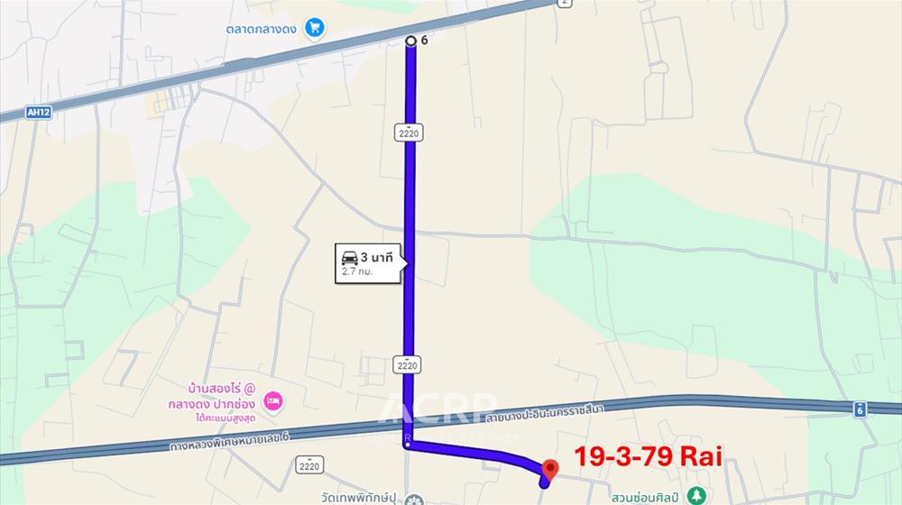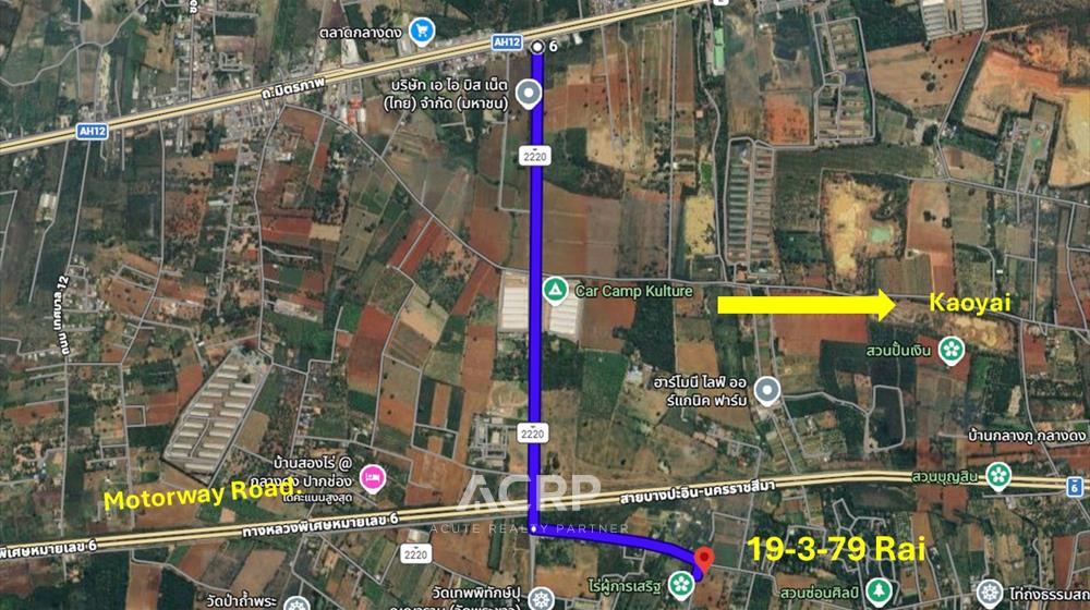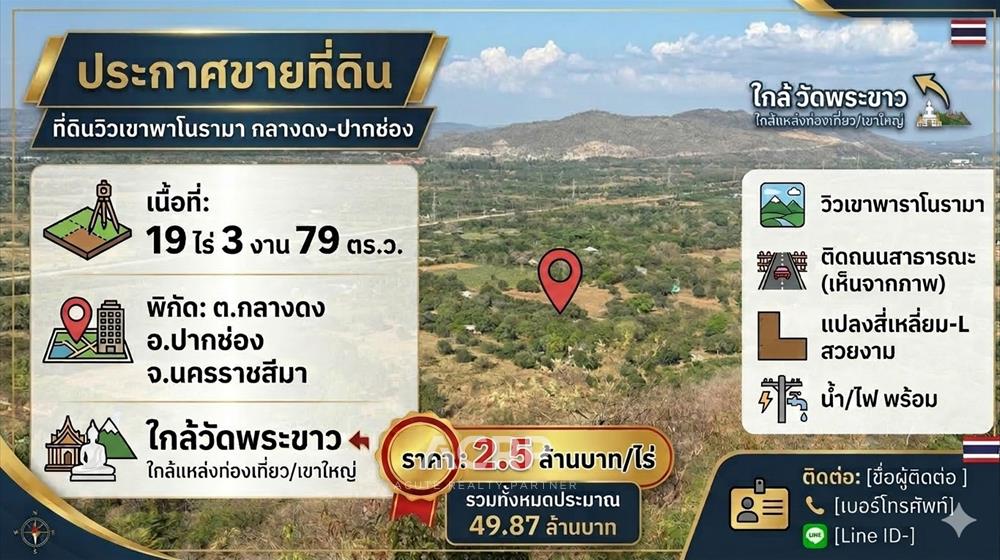 **Land for Sale – 19 Rai 379 sq.w. (7,979 sq.w.)** **Klang Dong, Pak Chong, Nakhon Ratchasima** **Price: 2.5 million baht per rai** **Panoramic Mountain View | Near Wat Phra Khao**## **Property Details****Type:** Vacant Land **Land Size:** 19 Rai 379 sq.w. (7,979 sq.w.) **Location:** Klang Dong Subdistrict, Pak Chong District, Nakhon Ratchasima **Coordinates:** 14.61837029, 101.27196414 **Title Deed:** Chanote (Red Garuda), ready for transfer, no encumbrances **Zoning:** Green Zone (Agricultural/Environmental Conservation) ## **Key Features**- Large rectangular land plot with a beautiful, well-proportioned shape - Land has been filled and leveled; elevation approx. 370 meters above sea level - Backs onto natural mountain terrain with a wide **panoramic mountain view** - Clear view of the iconic **white standing Buddha statue** of *Wat Phra Khao (Wat Thep Phithak Punnaram)* - Direct access to a public concrete road; very convenient entry and exit - Utilities available: **electricity and water ready for connection** ## **Nearby Landmarks** ### **Within 5–10 minutes**- **Wat Phra Khao (Wat Thep Phithak Punnaram)** – visible from the land - Wat Klang Dong School & Wat Klang Dong - Klang Dong Market, gas stations, and convenience stores (7-Eleven, CJ Express) ### **Within 15–20 minutes**- Pak Chong Nana Hospital - Klang Dong Police Station ### **Popular Attractions within 20–30 km**- **Khao Yai National Park** – the green lung near Bangkok - **Farm Chokchai** – famous agro-tourism destination - **Suwan Farm** (Rai Suwan)## **Accessibility**Only **2.7 km from Mittraphap Road**, offering easy and straightforward access.